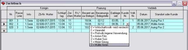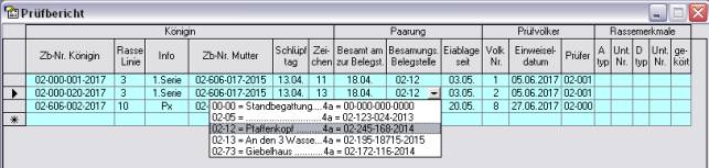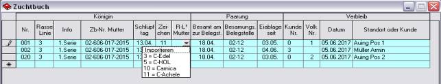die Zuchtserie oder die Herkunft der Königin notiert werden (Umschaltung bei Optionen).
